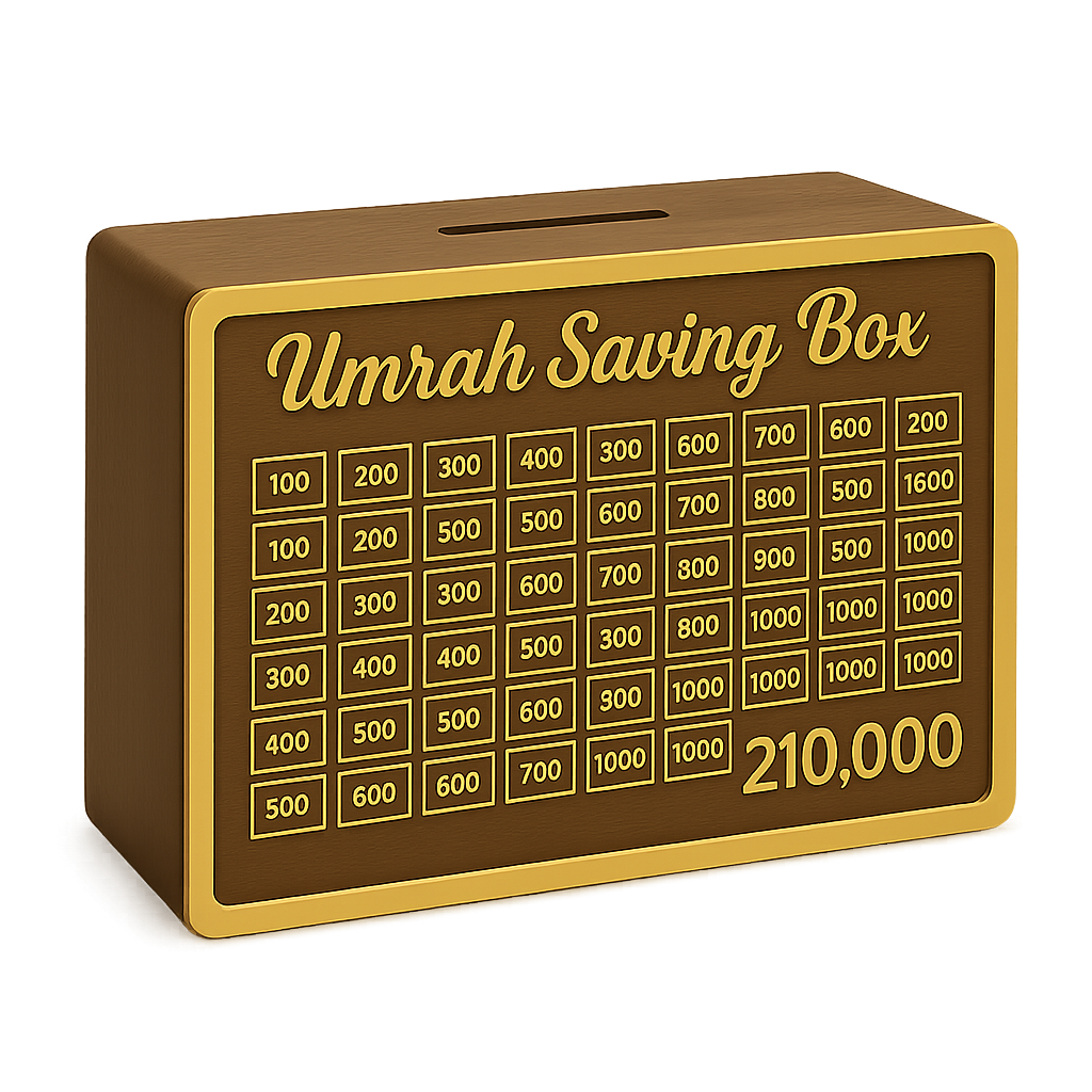 Start your journey to Umrah with this beautiful saving box. Save a small amount daily and watch your dream come closer with every coin you put in. Made with quality material and elegant Islamic design to motivate you every day.